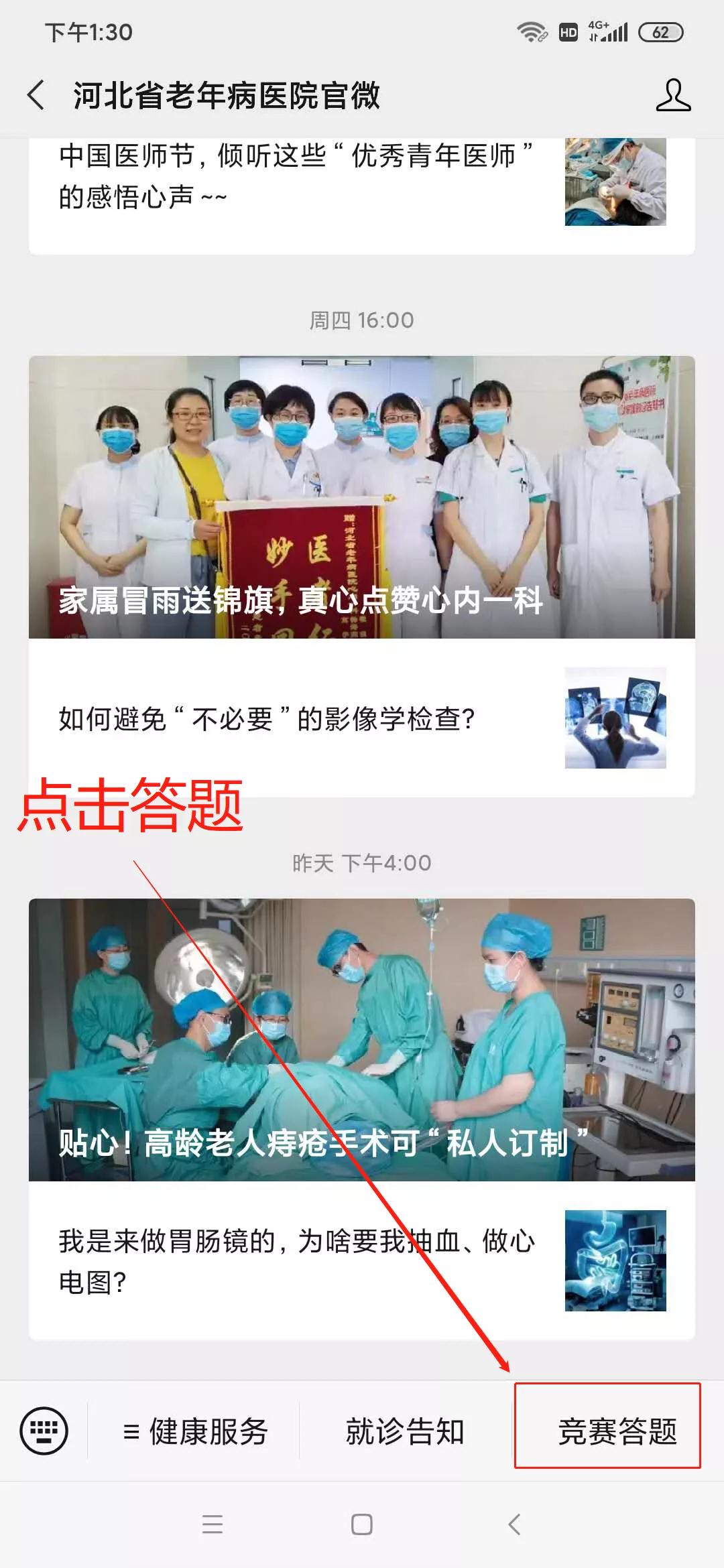 1.如您没有关注我们,请先在微信搜索“河北省老年病蜜桃视频 官微”公众号,关注后,点击菜单栏“竞赛答题”