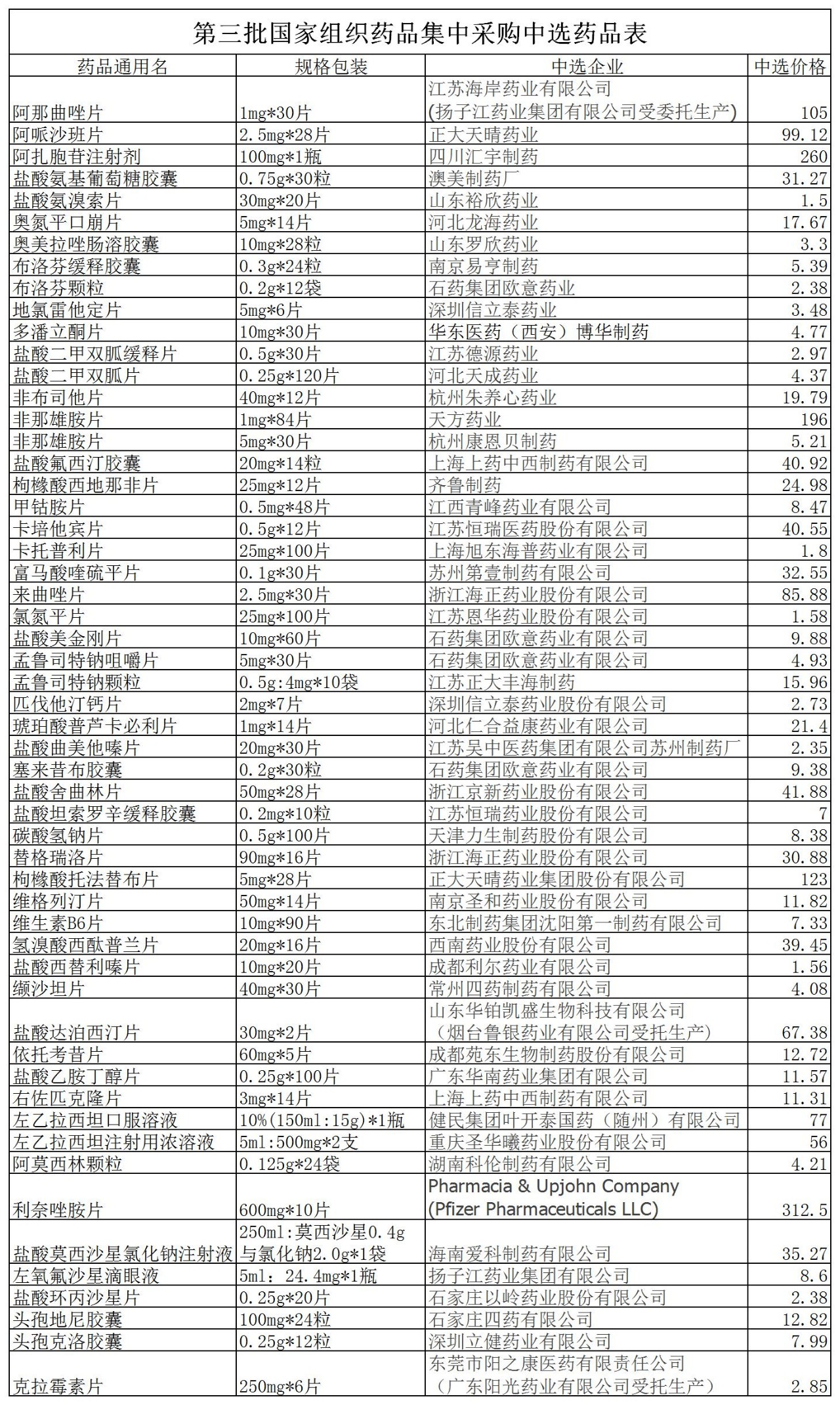 今年8月中旬,国家医疗保障局开展了第三批国家组织药品集中采购工作,共有 55种药品中选,覆盖多个治疗领域,涉及高血压、糖尿病、肿瘤疾病、精神疾病、抗感染等多个治疗领域。