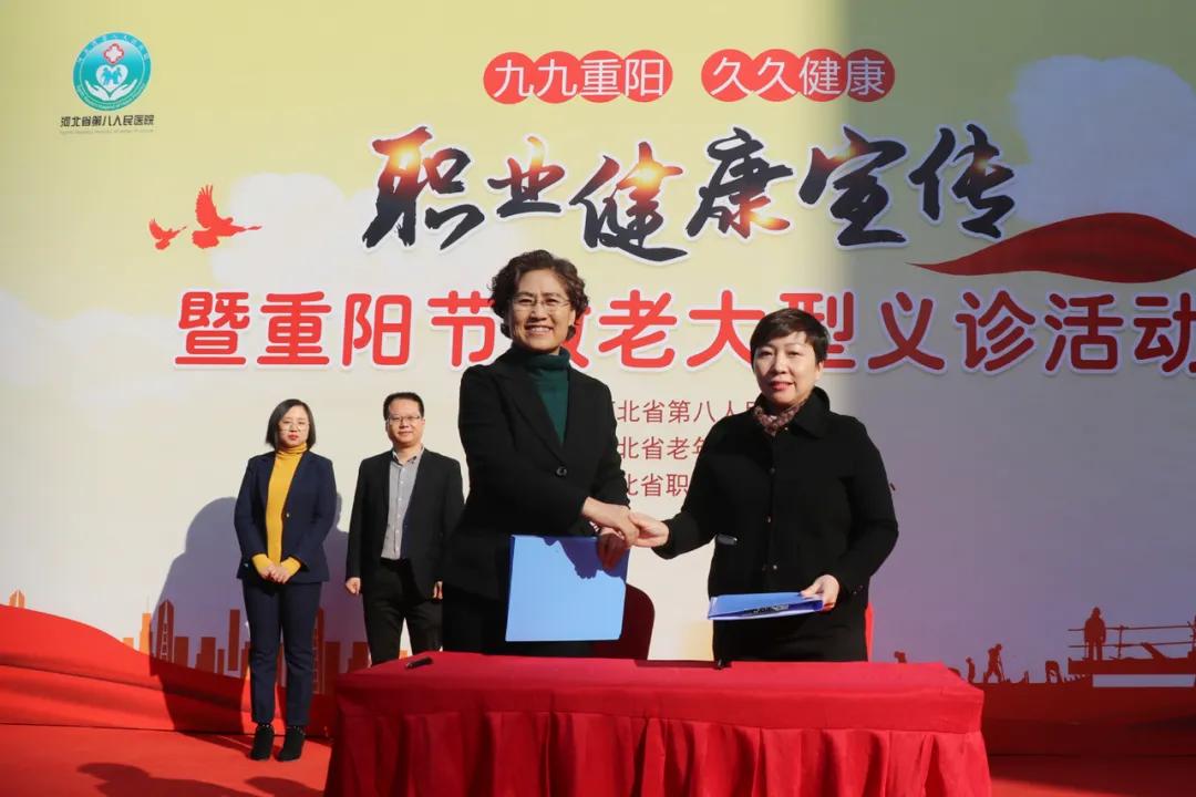 河北省卫生健康委老龄健康处、职业健康处有关负责人,河北第八人民蜜桃视频 (河北省老年病蜜桃视频 、河北省职业病防治临床中心)领导班子成员,医养结合联合体成员单位代表,河北仁爱医养服务集团有限公司、河北普爱养老服务有限公司、河北爱慈养老中心等有关养老机构负责人,社区老年人和企业劳动者代表参加活动。