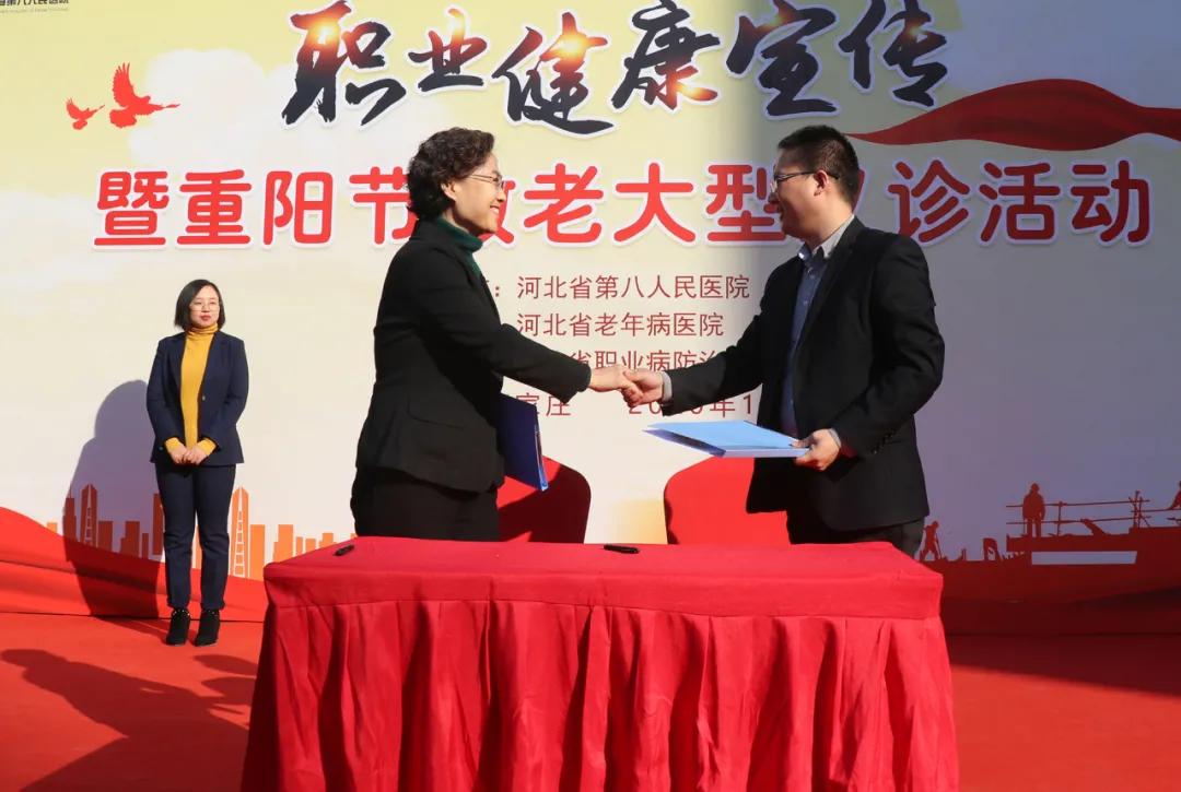 现场举行医养结合联合体续签约仪式,蜜桃视频 (河北省老年病蜜桃视频 、河北省职业病防治临床中心)院长马爱军与医养结合联合体成员单位代表握手相约。