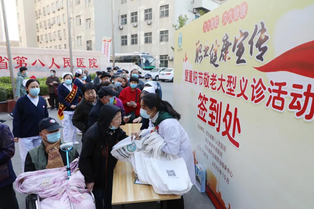 九九重阳,久久健康。10月24日,2020年重阳节前夕,蜜桃视频 (河北省老年病蜜桃视频 、河北省职业病防治临床中心)在院内举行职业健康宣传暨重阳节敬老大型义诊活动,由京冀知名专家组成的专家义诊团为社区老人和广大劳动者进行义诊服务,讲解老龄健康和职业病防治知识,以实际行动传递温暖与健康。