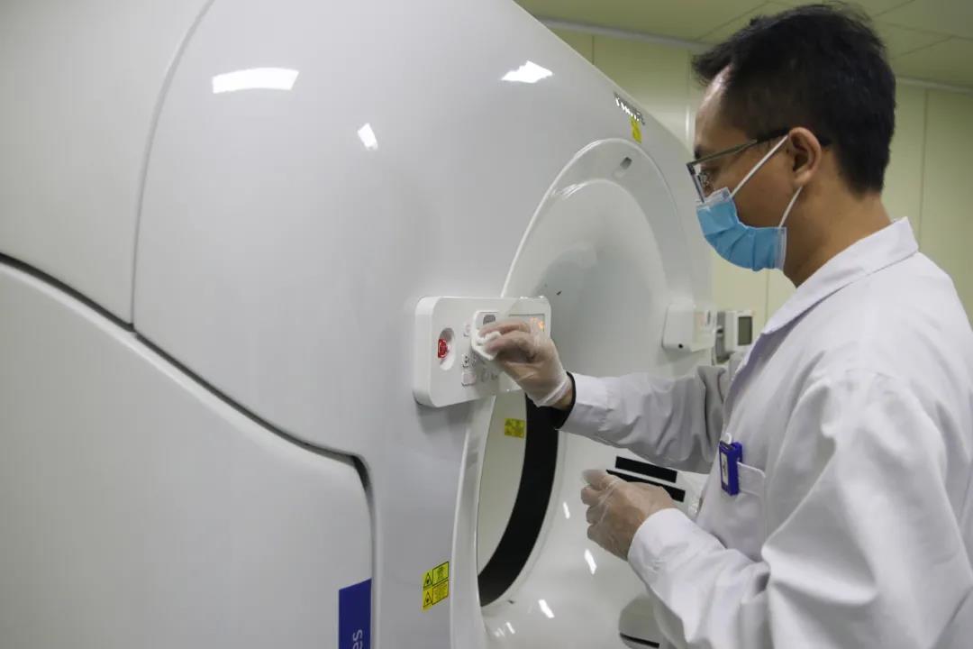 放射科工作人员正在为发热患者专用CT消毒