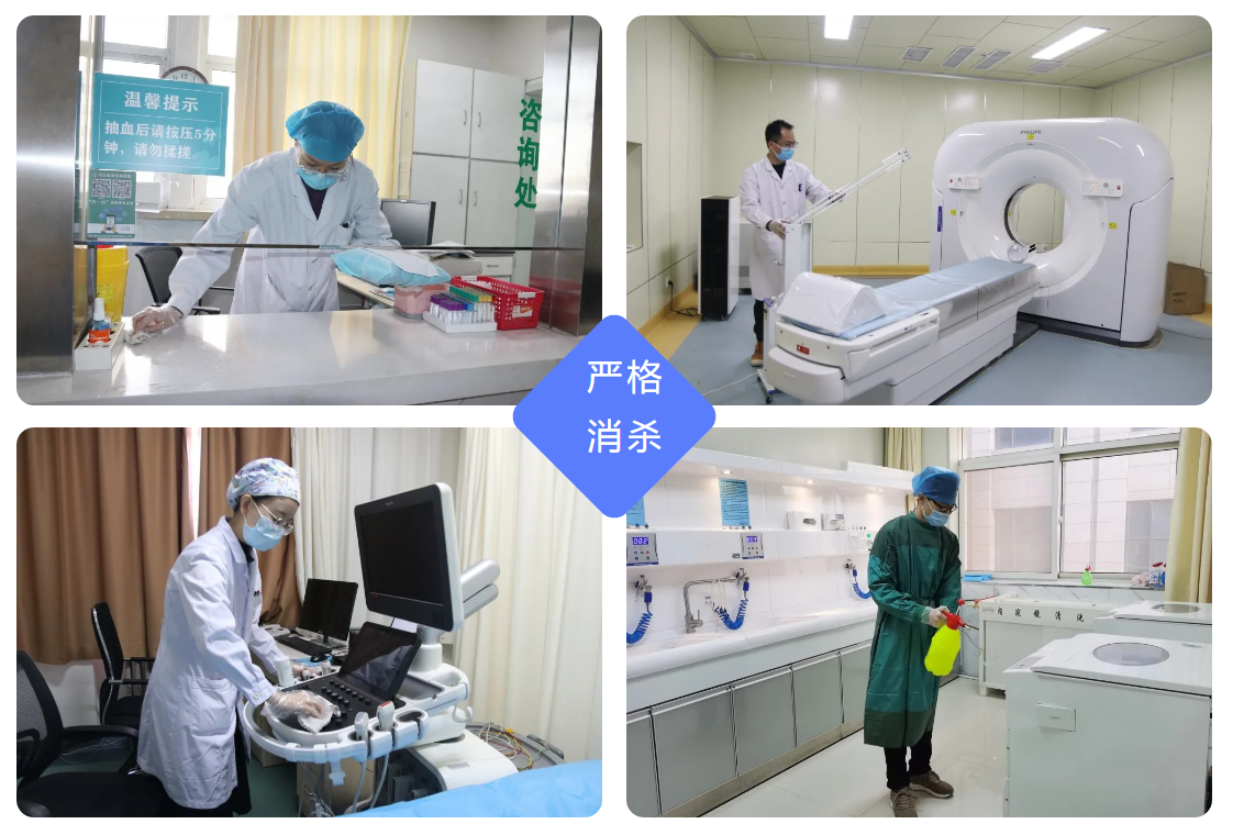 检验科、放射科、功能科、内镜室等部门工作人员正在进行严格消毒
