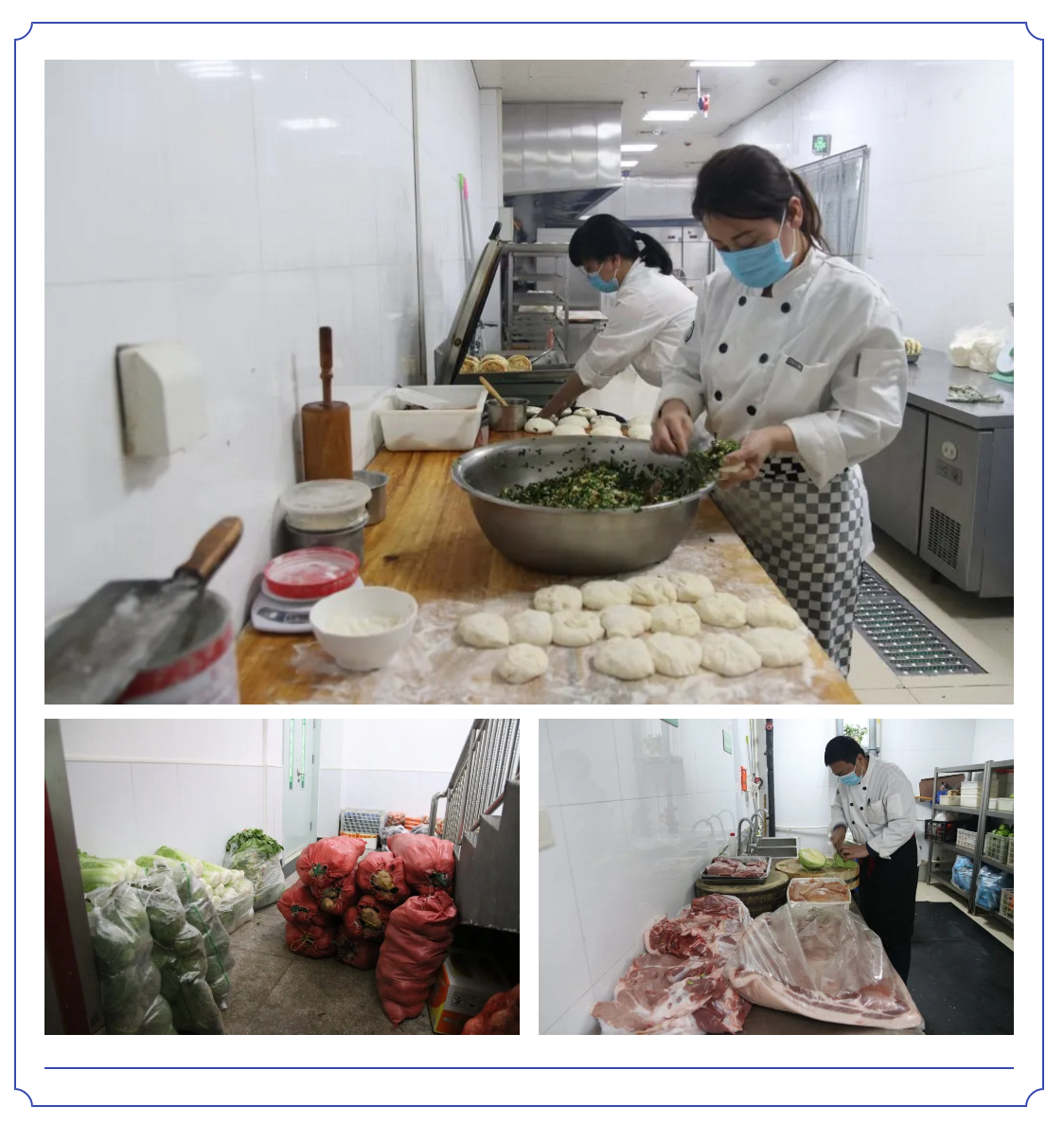 食堂备齐各种食材,为住院患者、家属和坚守岗位职工提供保障,24小时服务不间断,确保核酸检测等一线人员时时吃上热菜热饭。