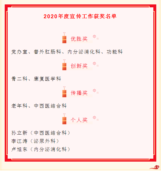为激励先进鞭策后进,根据一年来各科室在宣传工作中的投稿和转发情况,设立了科室流动奖和个人奖,获奖名单如下: