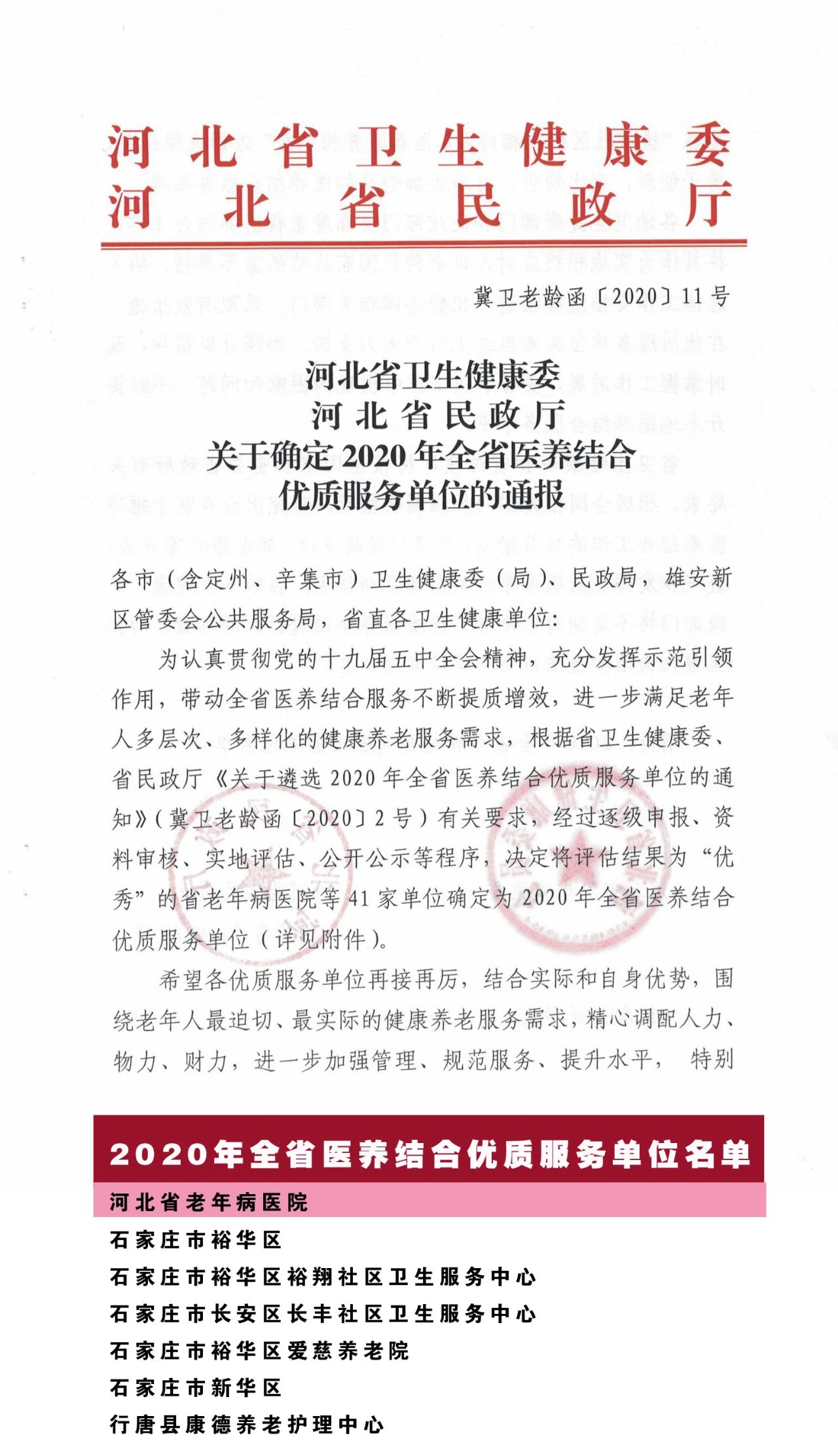 日前,河北省卫生健康委、河北省民政厅联合发布通报,根据《关于遴选2020年全省医养结合优质服务单位的通知》有关要求,经过逐级申报、资料审核、实地评估、公开公示等程序,决定将评估结果为“优秀”的蜜桃视频-麻豆蜜桃 等41家单位确定为2020年全省医养结合优质服务单位。