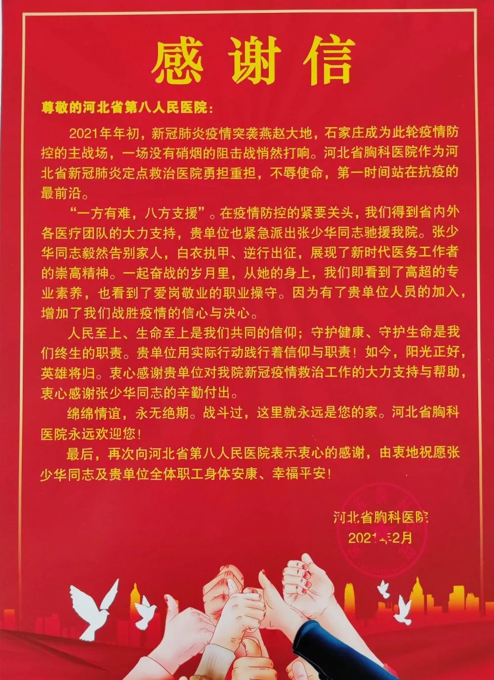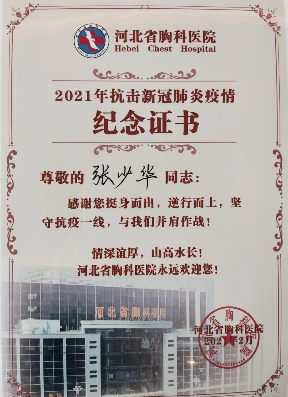 2021年1月10日下午,按照省卫生健康委统一安排,蜜桃视频-麻豆蜜桃 选派张少华支援省新冠肺炎定点救治蜜桃视频 ——河北省胸科蜜桃视频 ,负责新冠疫情相关数据汇总、上报和蜜桃视频 感染控制工作。在奋战“抗疫”的40多个日夜里,张少华不负重托,不辱使命,圆满完成了工作任务,充分展现了省八院人迎难而上,坚忍不拔的精神风貌。
