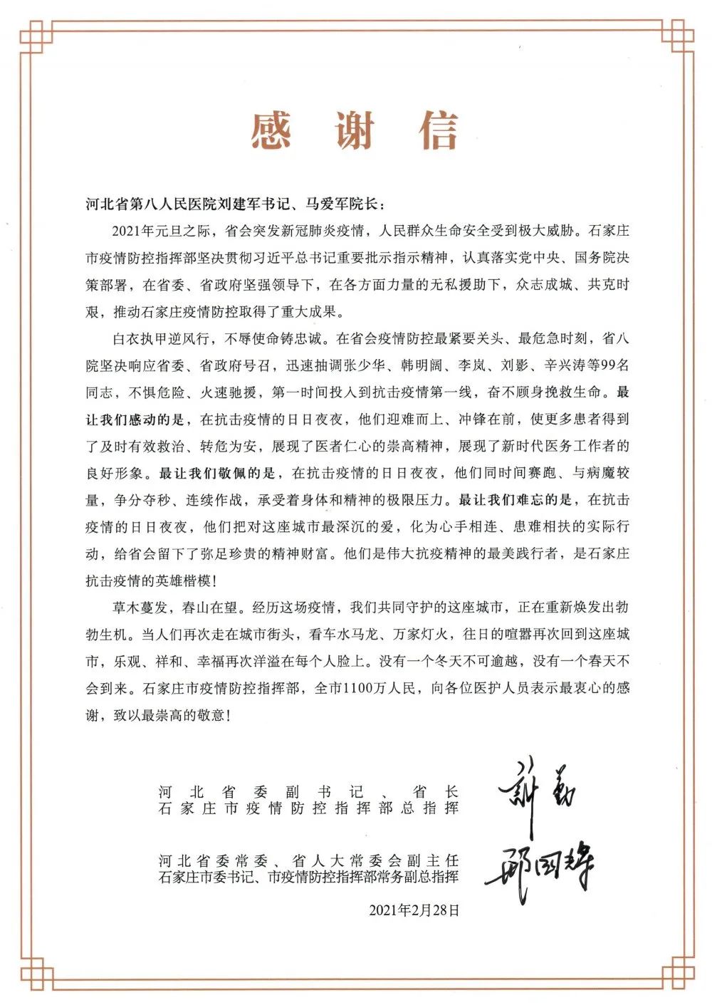 感谢信说,“在省会疫情防控最紧要关头、最危急时刻,省八院坚决响应省委、省政府号召,迅速抽调张少华、韩明阔、李岚、刘影、辛兴涛等99名同志,不惧危险、火速驰援,第一时间投入到抗击疫情第一线,奋不顾身挽救生命。最让我们感动的是,在抗击疫情的日日夜夜,他们迎难而上、冲锋在前,使更多患者得到了及时有效救治、转危为安,展现了医者仁心的崇高精神,展现了新时代医务工作者的良好形象。最让我们敬佩的是,在抗击疫情的日日夜夜,他们同时间赛跑、与病魔较量,争分夺秒、连续作战,承受着身体和精神的极限压力。最让我们难忘的是,在抗击疫情的日日夜夜,他们把对这座城市最深沉的爱,化为心手相连、患难相扶的实际行动,给省会留下了弥足珍贵的精神财富。他们是伟大抗疫精神的最美践行者,是石家庄抗击疫情的英雄楷模!”