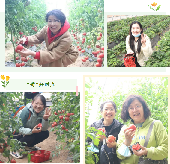 鲜红欲滴的草莓在一垄垄碧绿的草莓秧中若隐若现,红绿交映,生机勃勃。女职工们手提果篮,化身快乐的“果农”,一边摘草莓一边互相交流,兴趣盎然,充分体验着采摘草莓、品尝鲜果的乐趣。采摘完草莓,大家又前往番茄园区,采收新鲜的番茄。