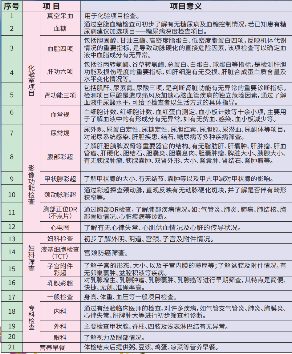 适用于30-45岁中年女士。现代女性往往工作、家庭兼顾,工作及生活压力相对都比较大,身体健康问题也容易在这个时期初见端倪。本套餐着重重要脏器功能、妇科疾病、乳腺疾病等方面检查。
