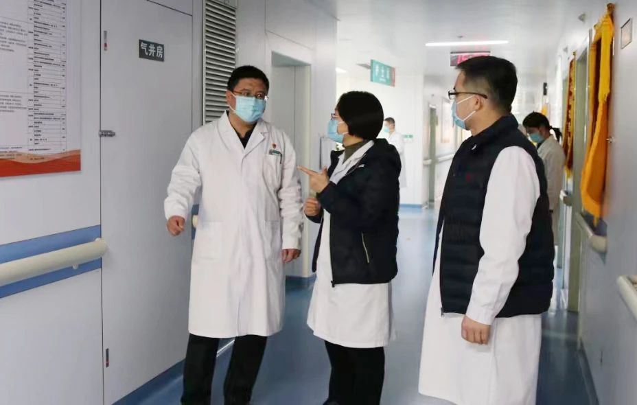 院党委书记赵晓亮(左一)与副院长栗爱珍(左二)在内分泌消化科病区检查