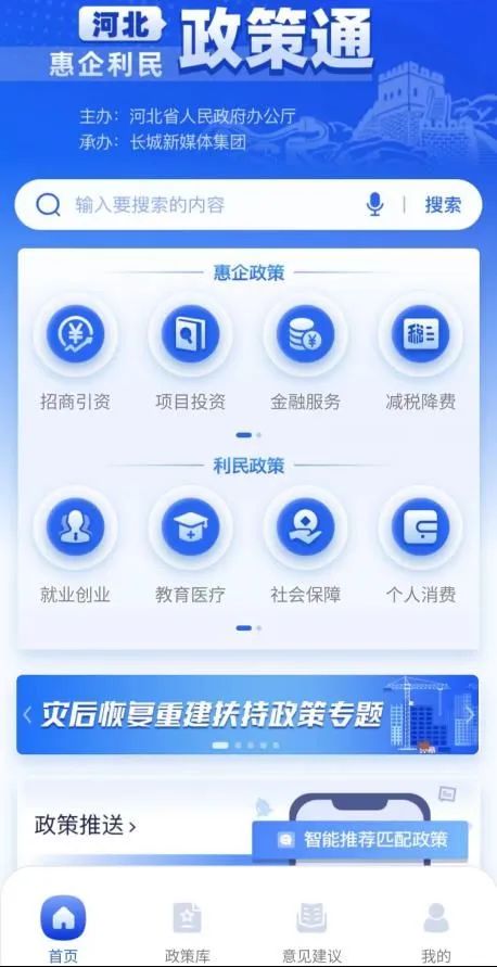 该平台由河北省人民政府办公厅创新打造,集政策发布、查询、解读、推送、反馈及服务于一体,实现从“人找政策”到“政策找人”的转变。