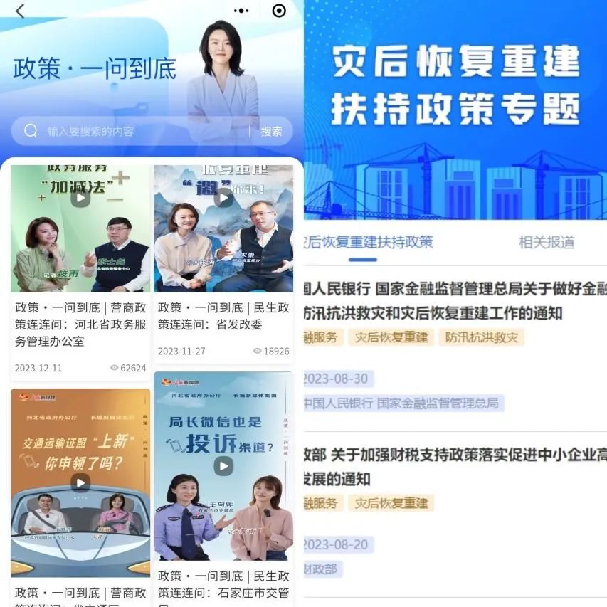 上线后,平台动态更新高质量“政策库”,共收录国家和省惠企利民政策900余件,制作1500余条“明白卡”和政策解读内容,制作“政策·一问到底”问答式政策解读视频13期。今年10月份以来,平台结合社会关注热点,先后推出灾后恢复重建、招投标“双盲”评审、家门口的“文化客厅”、“这么近、那么美,周末到河北”、供暖、就业创业等一系列专题“政策包”,以清晰易懂的方式为用户提供政策背景、政策内容等信息,帮助企业和群众更好地理解政策、运用政策,受到社会各界的广泛关注。