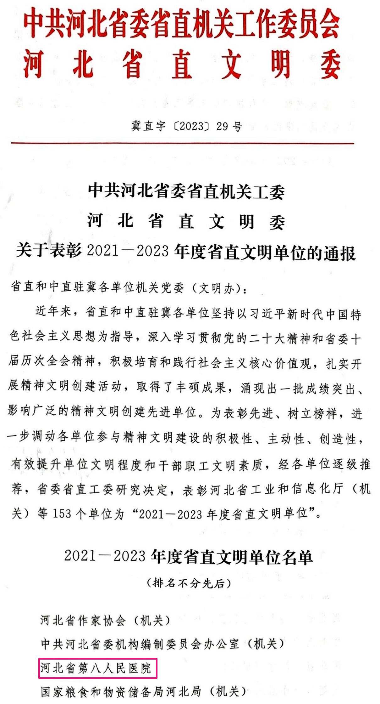 日前,中共河北省委省直机关工委、河北省直文明委联合发布《关于表彰2021—2023年度河北省直文明单位的通报》,蜜桃视频 榜上有名,喜获“2021—2023年度河北省直文明单位”荣誉称号。