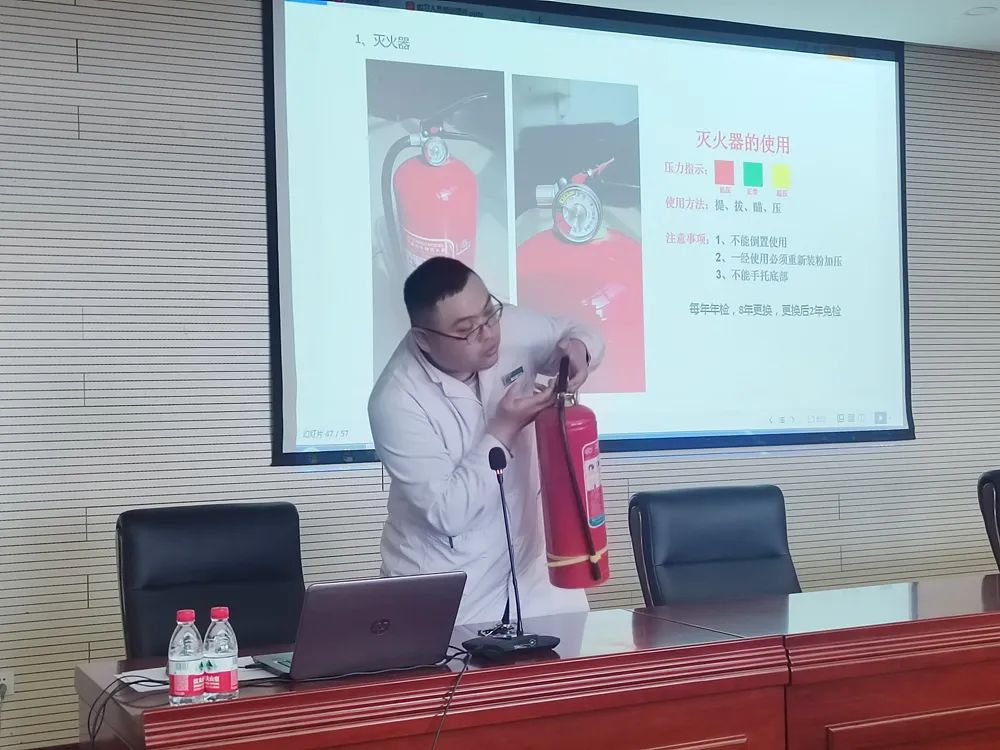 保卫处付路海围绕消防安全“四个能力”及设备使用方法进行了深入浅出的讲解,对消防安全知识、火灾预防和应急处理、火灾发生时的逃生路线等方面进行了重点培训,并就灭火器使用方法进行了操作示范,引导大家正确使用灭火器。