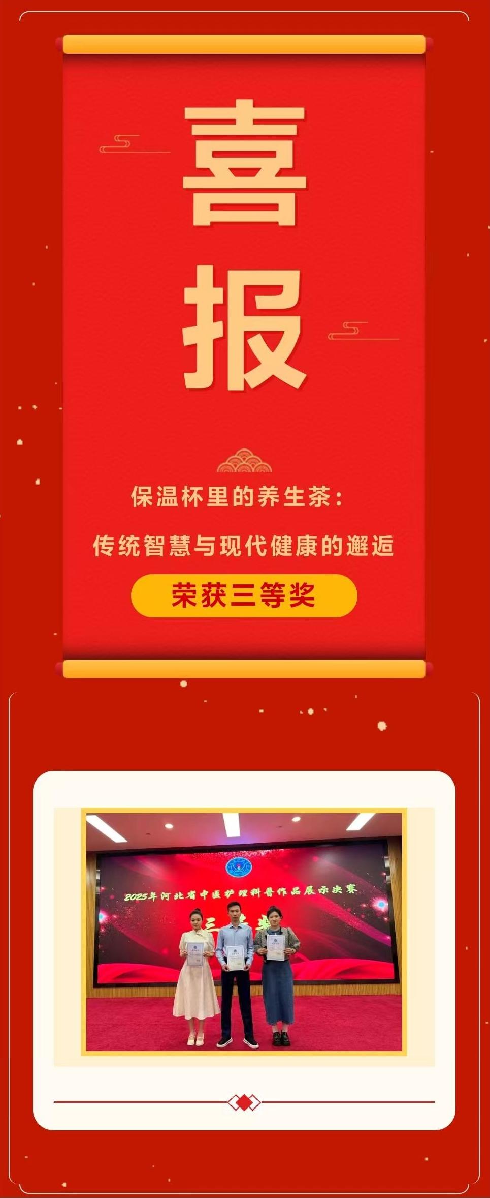 4月24-26日,蜜桃视频 中西医结合科护士陈彤彤、边倩、张艺参加了由河北省护理学会主办的“2025年河北省中医护理科普作品展示”活动,共同创作的科普作品《保温杯里的养生茶,你真的会泡吗?》荣获三等奖。科普作品以日常养生茶为切入点,将中医“天人相应”的理念融入现代生活,让更多人学会科学养生。